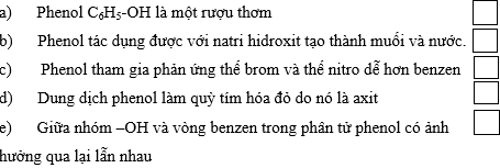 d) Phenol có tính axit yếu nhưng dung dịch phenol trong nước không làm đổi màu quỳ tím.